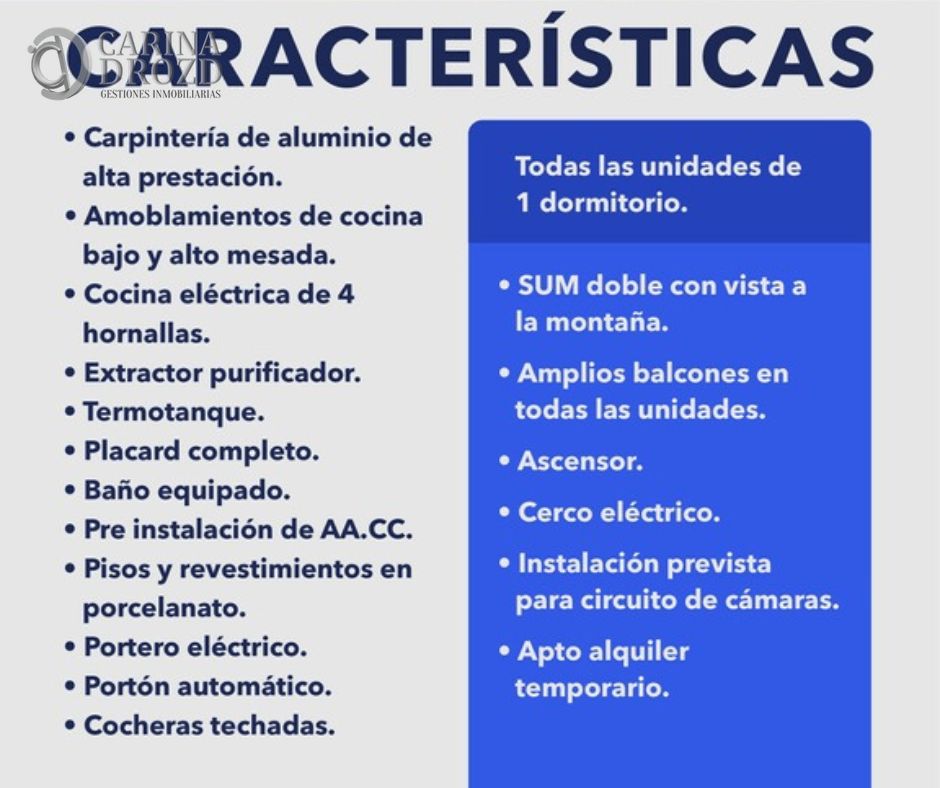 “CARINA DROZD gestiones inmobiliarias» VENDE: DEPARTAMENTOS Ubicadísimos! A ESTRENAR! Calle JUAN B. JUSTO 533, B° Bombal Sur, Dpto. Godoy Cruz- Ultimas 3 Unidades. A pocas cuadras de la ciclovía, adyacencias al Casino de Mendoza. APTOS ALQUILERES TEMPORARIOS. El edificio esta compuesto por 3 pisos con 10 unidades de construcción tradicional. ASCENSOR. Cuentan con: COCINA COMEDOR con amoblamientos completos de alacenas y bajomesada, cocina electrica de 4 hornallas, extractor purificador y termotanque. 1 BAÑO con equipamiento completo. 1 DORMITORIO con gran placard. LAVANDERIA sectorizada – BALCON amplio- COCHERA techada con portón automático. DISPONIBLES : Dptos 2° PISO: frontal izquierdo de 53m2 propios: U$S 90.000 – Frontal Derecho de 56m2 propios U$S 93.000 – 1° PISO frontal izquierdo de 53m2 U$S 90.000 . Además el edificio cuenta en el tercer piso con SUM con vistas a la montaña. ENTREGA EN NOVIEMBRE 2.025.