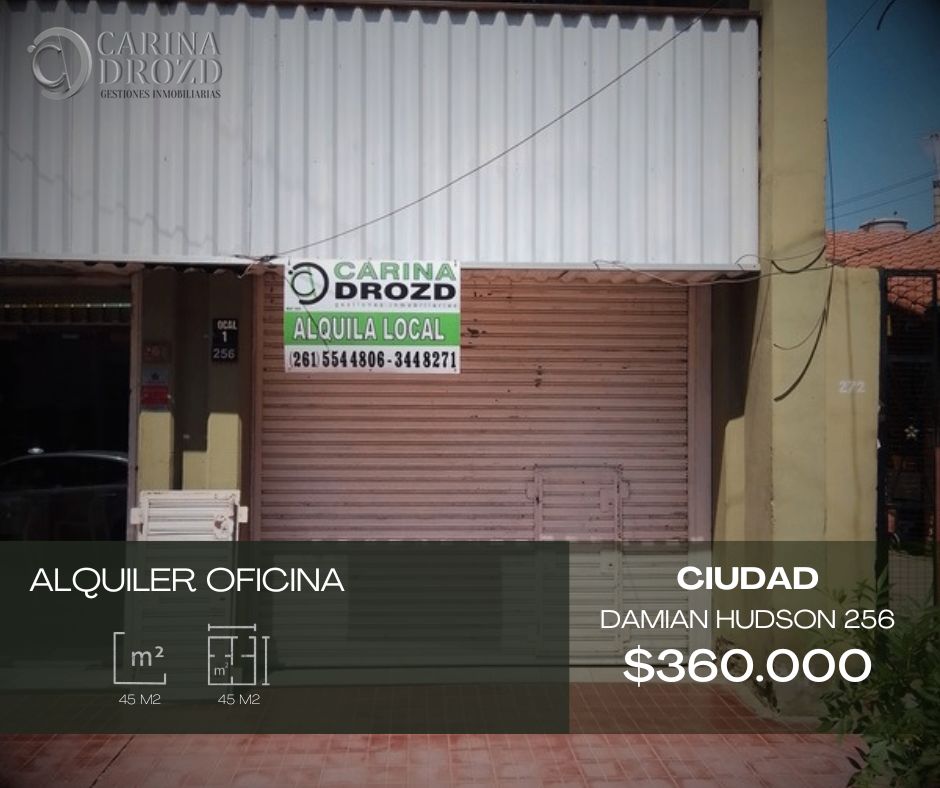«CARINA DROZD gestiones inmobiliarias» ALQUILA: Excelente LOCAL/ OFICINAS FRONTAL al norte! CIUDAD/ 4ta Sección Oeste- Calle DAMIAN HUDSON 256, entre Avda. España y Patricias Mendocinas USO COMER-CIAL: Local (todo menos elaboración de comidas o cafés)/ Oficinas Profesionales, Comerciales, Administrativas. SUPERFICIE: 45 m2. PLANTA BAJA. Frente Vidriado, Cierre con persiana metálica automática, de enrollar. RECEPCION con estanterías- SALON- 1 PRIVADO con ventana- KITCHINETTE Mesada y bacha de acero inoxidable – 1 BAÑO completo. Recién Pintado. Sin gas. VALOR: $ 360.000. Expensas $ 12.000